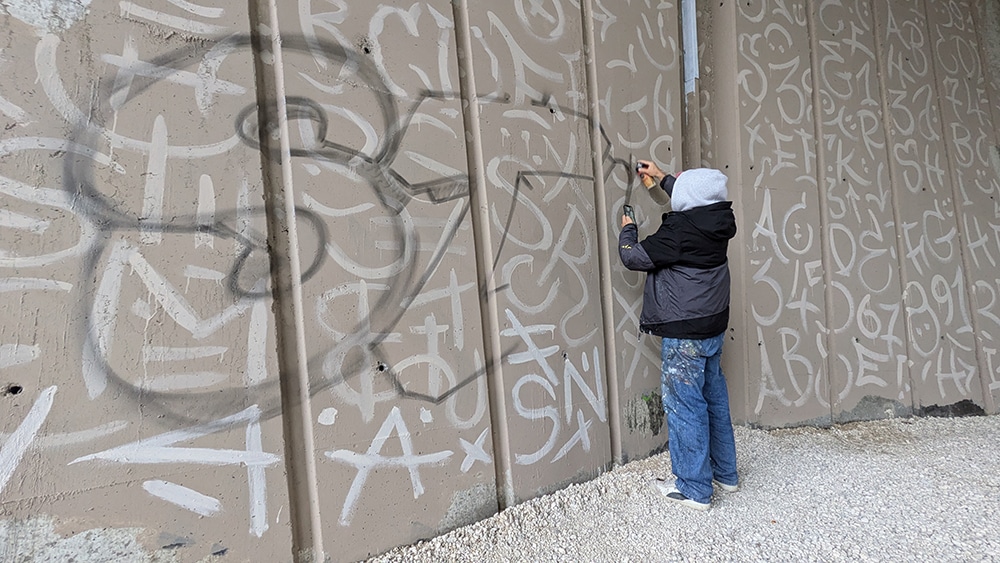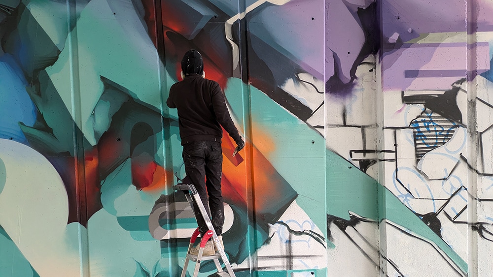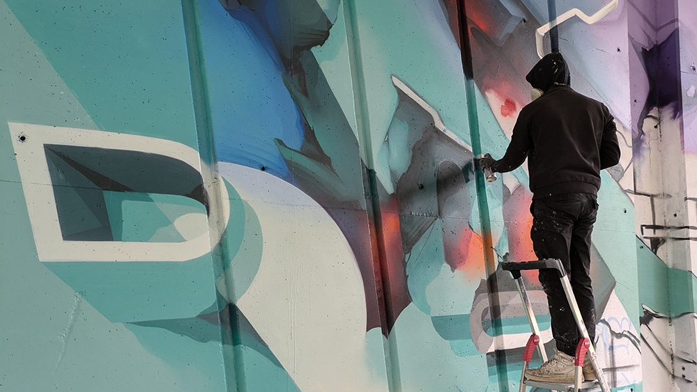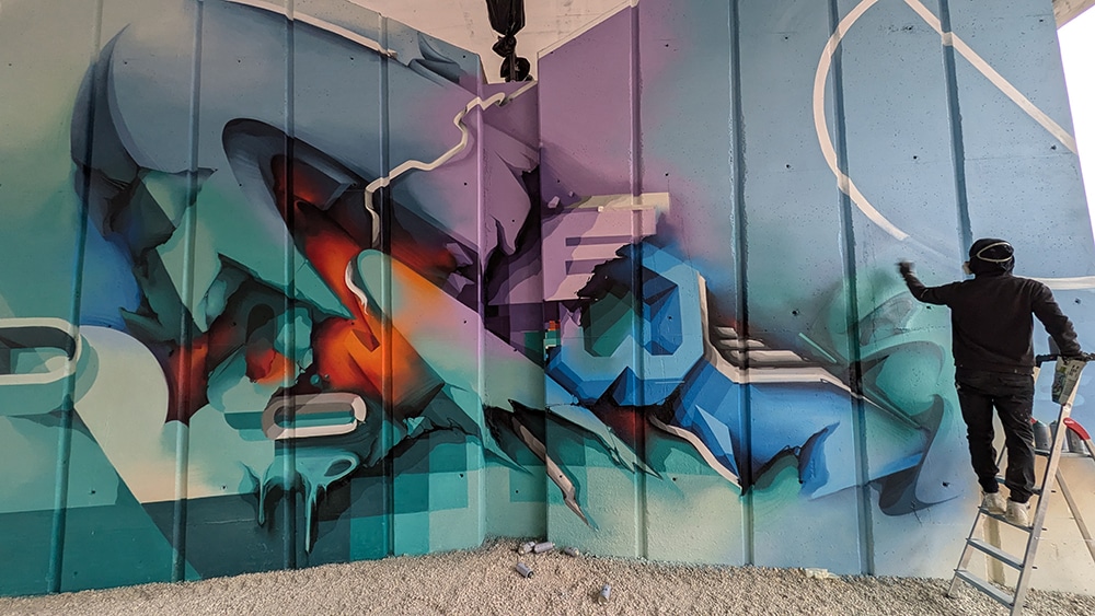 L’artiste Does, connu pour son style abstrait et sophistiqué, a signé une fresque dynamique et moderne. Mélangeant des formes géométriques, des dégradés subtils et des couleurs intenses, il crée une œuvre fluide qui combine harmonieusement le graffiti traditionnel et l’art contemporain. Inspirée par le mouvement et l’énergie, la fresque s’intègre parfaitement à l’environnement, offrant une interprétation abstraite qui stimule l’imagination. Cette création reflète l’esprit novateur et urbain du « Spot« .