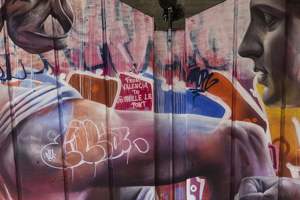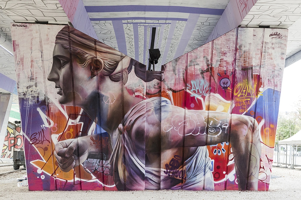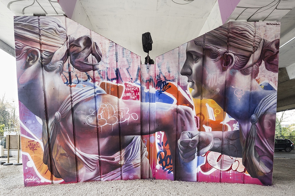 Le duo d’artistes espagnols PichiAvo, reconnu leur style pictural unique qui fusionne l’esthétique classique avec l’énergie brute du graffiti contemporain, a enrichi Le Spot de deux fresques iconiques. Elles représentent des bustes féminins inspirés de la statuaire grecque en pleine dynamique, cette œuvre met en scène la puissance et la grâce à travers un jeu subtil de contrastes. Les bustes, peints avec une précision réaliste, sont juxtaposés à des arrière-plans vibrants de couleurs et de motifs graffiti, créant une tension visuelle entre l’ancien et le moderne. Les nuances douces des figures contrastent avec les teintes éclatantes et les tags, renforçant l’idée d’un dialogue entre tradition et expression urbaine.