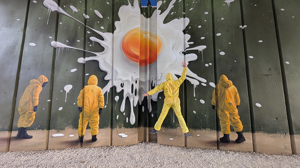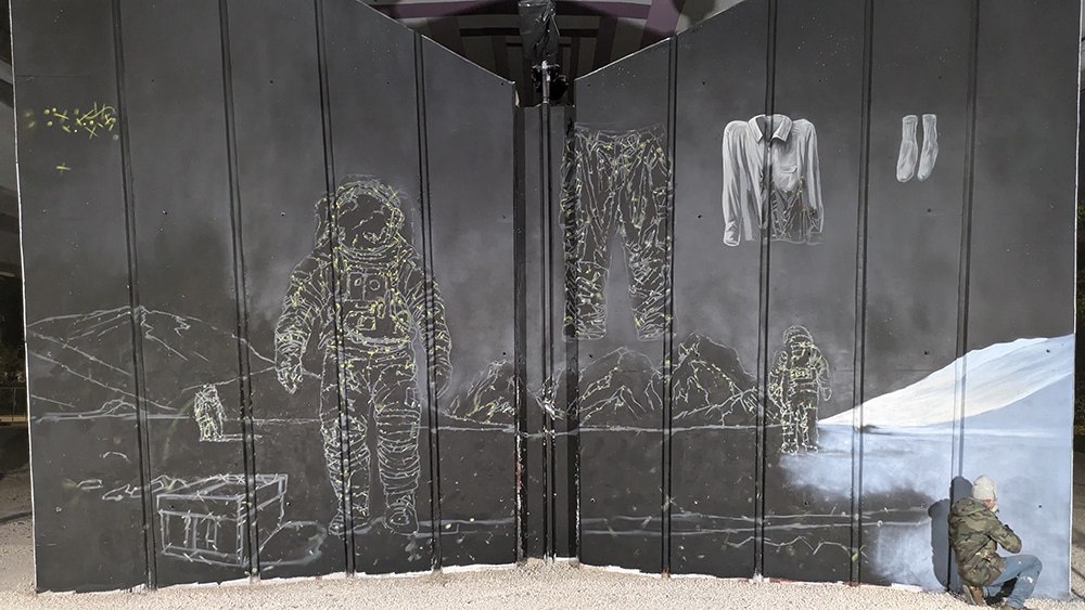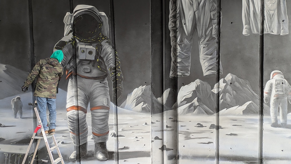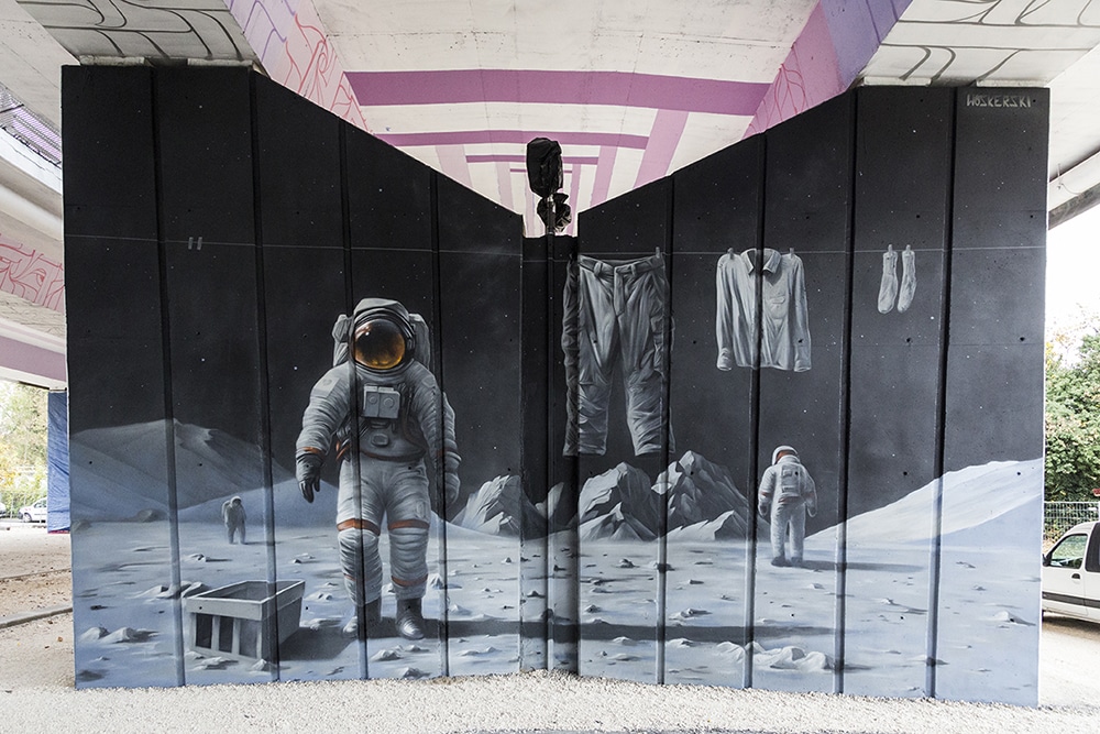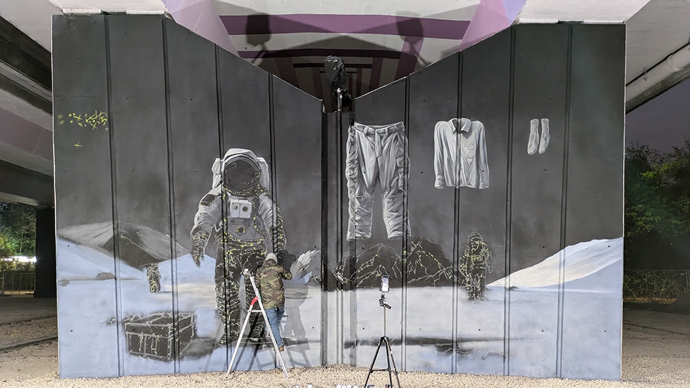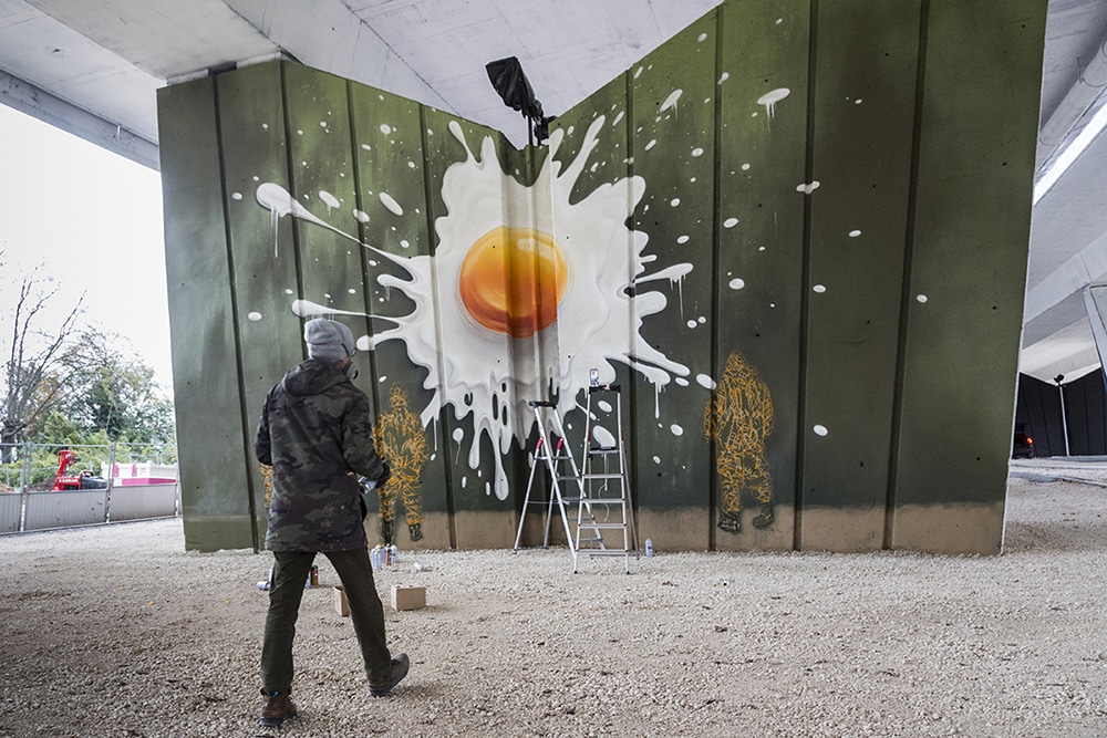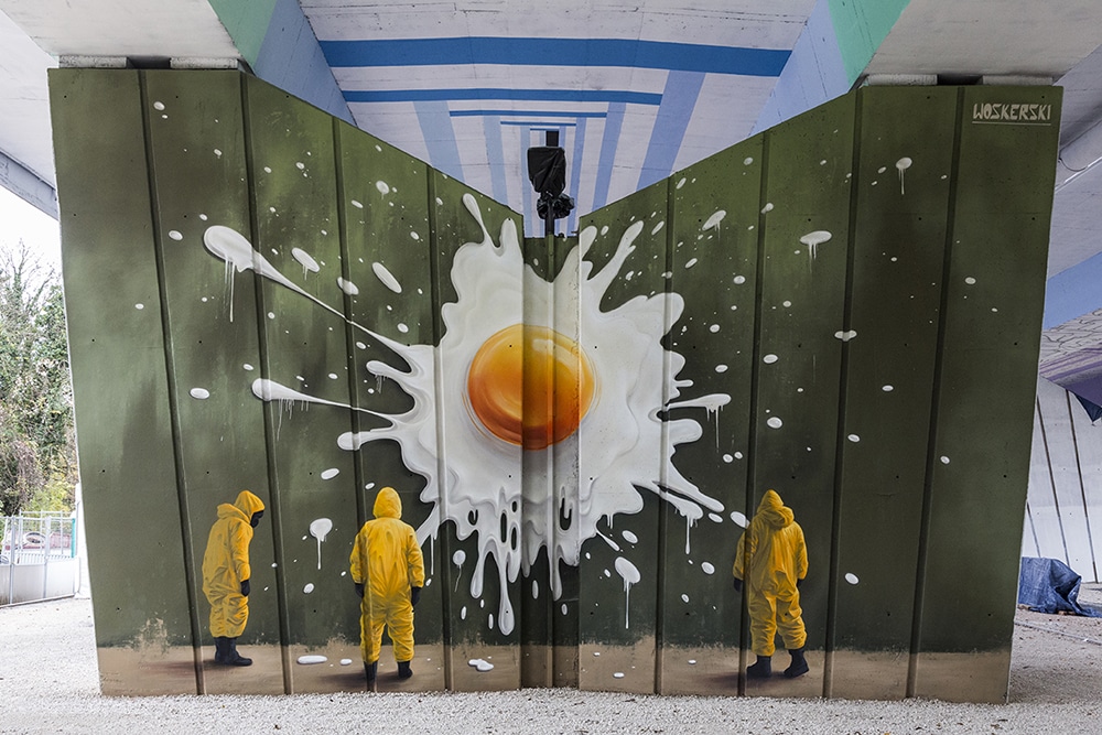 Woskerski, artiste londonien reconnu pour ses fresques murales mêlant art de rue et influences graphiques, a enrichi « Le Spot » de deux œuvres incroyables. La première, intitulée « Laundry Day », dépeint une scène réaliste et humoristique d’un astronaute, dans un paysage lunaire, qui fait sècher sa combinaison sur une corde à linge, illustrant son talent pour le surréalisme teinté d’ironie. La seconde, « Eggsplosion », capture l’instant dynamique d’un œuf éclatant, démontrant sa maîtrise du photoréalisme et son goût pour des sujets inattendus.